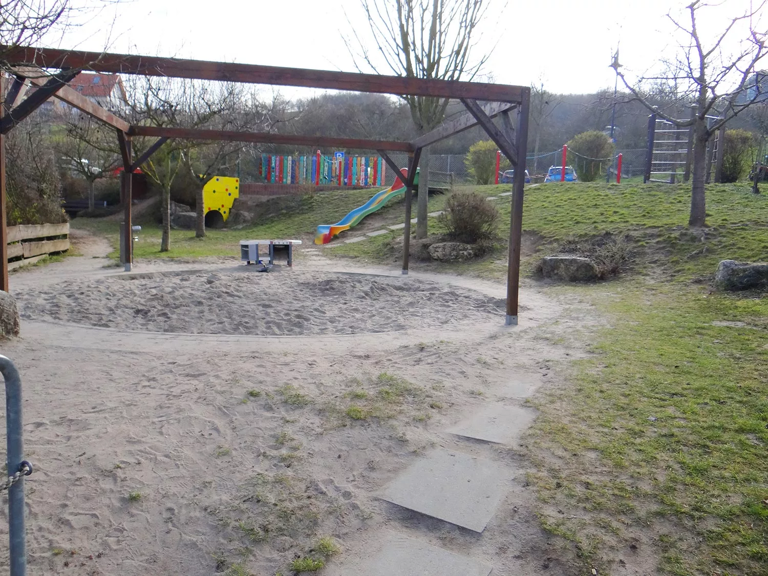 Unser großzügiges Außengelände besitzt eine große Terrasse, die auch von der Gruppenräumen zugänglich ist und die die Kinder vielfältig nutzen können. Der ein wenig ansteigende Garten ist über eine Treppe zu erreichen und lädt mit Sandkasten, Schaukel, Hangrutsche und Klettergerüst zum Spielen ein. Mit Hilfe einer eingebauten Betonröhre können die Kinder interessante Spielideen entwickeln. Einige Obstbäume locken im Sommer mit ihren Früchten. Vor dem Kindergarten befindet sich ein Parcours, den die Kinder mit den vielen, zur Verfügung stehenden Rädchen und Rollern befahren können.