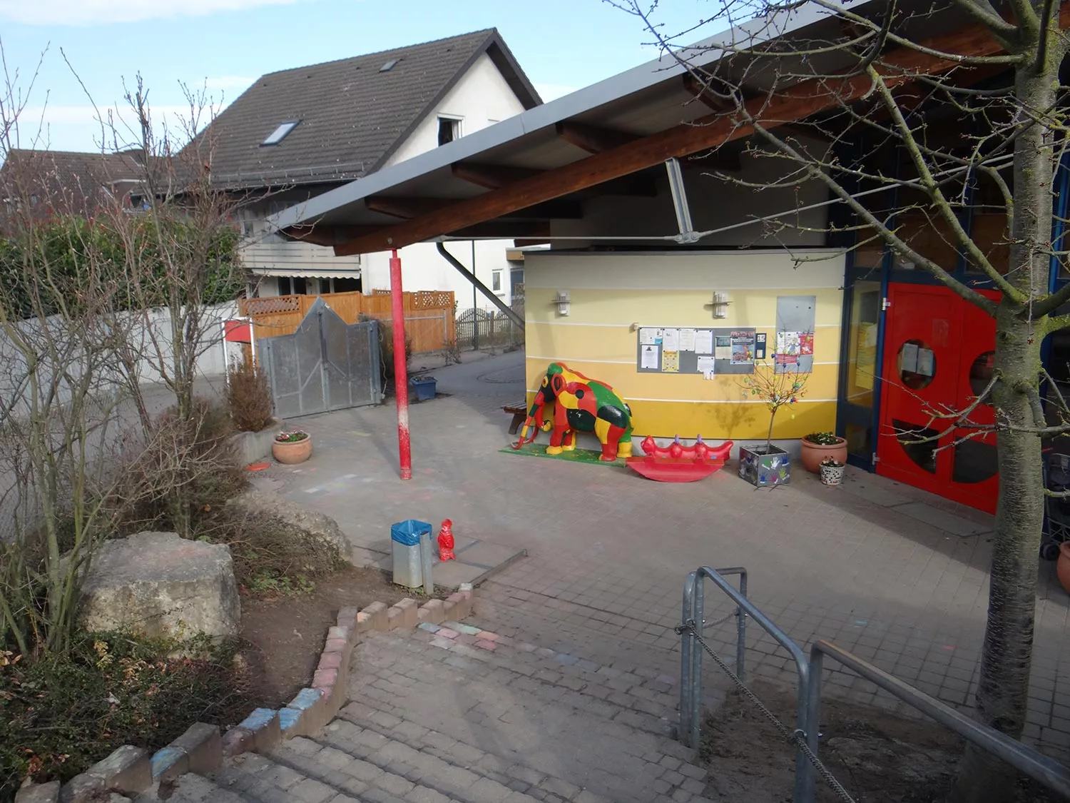 Die Kindertagesstätte hat zwei separate, behindertengerechte Eingänge, wobei aus Sicherheitsgründen zur Zeit nur ein Eingang von Eltern und Kindern genutzt wird.